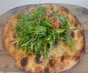 mini focaccia bread topped with rocket fresh tomatoes, red onion, basil, glaze balsamic, vinegar