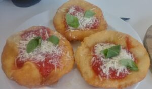 fried mini pizzas topped with tomato sauce, parmesan and basil