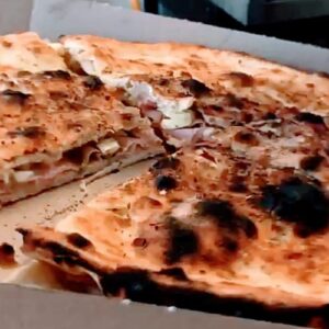Focaccia pizza stuffed with mortadella, fresh buffalo mozzarella and pistachio oil